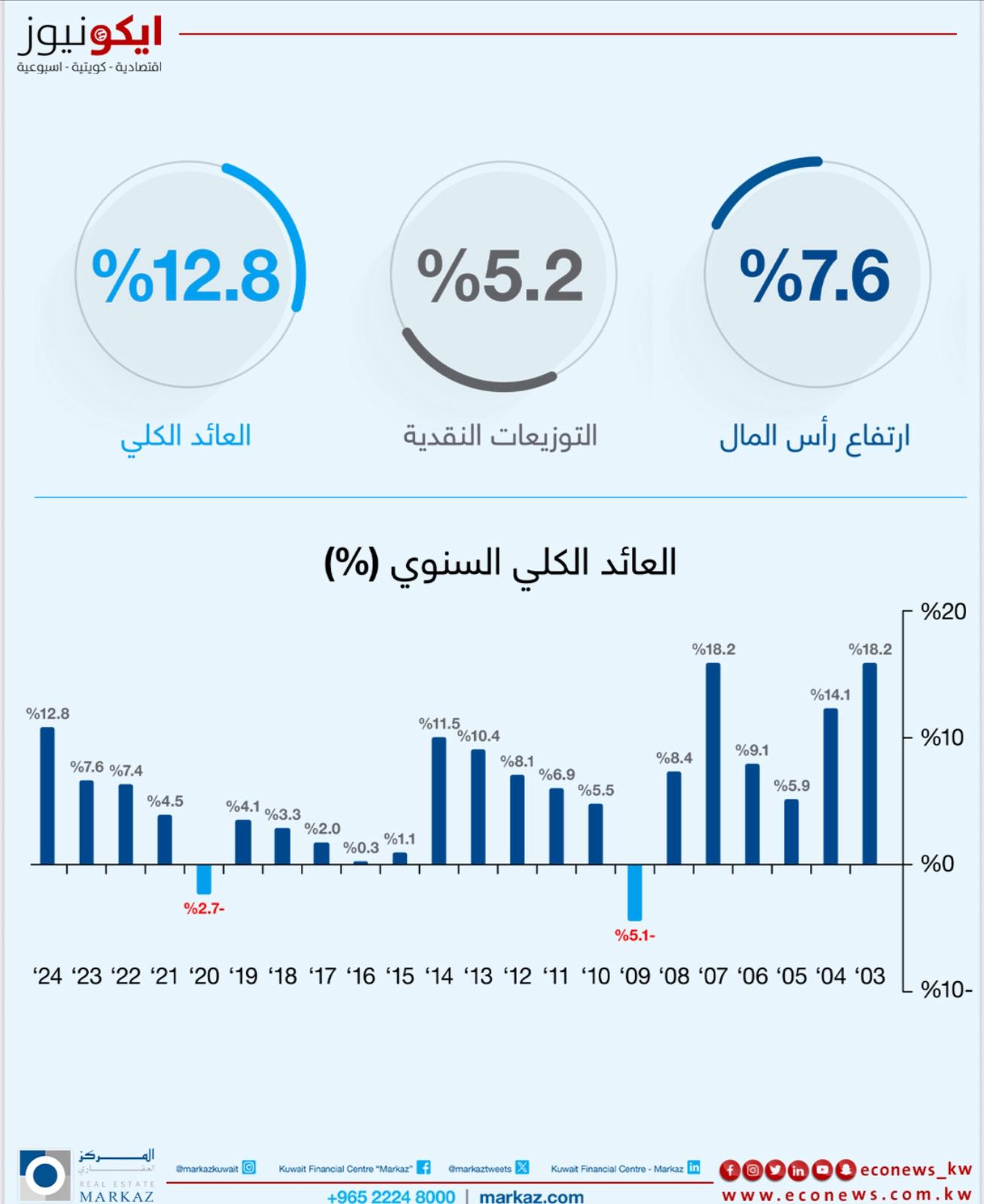 باعتباره من أوائل الصناديق العقارية في الكويت، حقّق صندوق "المركز" العقاري، المتوافق مع الشريعة الإسلامية، عوائد مرتفعة ومستقرة خلال تاريخه الممتد على مدار 22 عاما، حيث بلغ معدل العائد الداخلي 7.7% سنوياً. وخلال عام 2024، حقق الصندوق عائد إجمالي بلغ 12.8%.